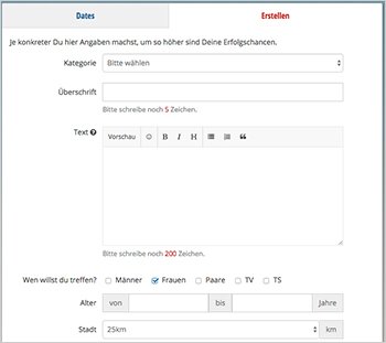 Sehr hilfreich ist natürlich die Suche an sich (Umkreis, Mitgliedertyp, Art des Dates). Doch auch das eigene Schalten eines Dates ist vorteilhaft und bringt mich schnell in die aktive Rolle:
