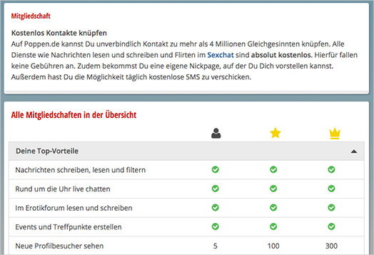 Jeder, der sich bei Poppen.de anmeldet, ist zunächst Basis-Mitglied. Das bedeutet keinerlei Kosten und einen Zugang zu den wichtigsten Funktionen: Profil komplett ausgestalten, mit anderen Mitgliedern chatten und Dates schalten.